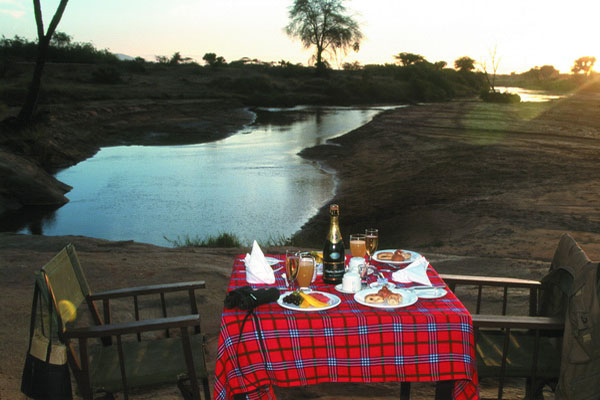 The dining area is built high on timber stilts and shaded by high vaulted thatched roofs. Overlooking both the river and the pool it is shaded by doum palms. There is a central bar also overlooking the river. Meals are buffet style and Samburu dance performances are offered.