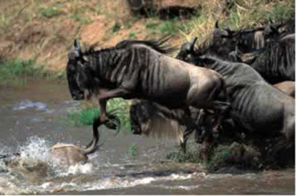 Arena for ‘the greatest wildlife show on earth' Between the end of July and November, over one and a half million wildebeest accompanied by half again as many zebras and gazelles, migrate from the short-grass plains of the Serengeti to fresh pasture in the grasslands of the Mara; thus creating one of nature's grandest spectacles. Moving in groups of up to 20,000 at a time they thunder across the plateau hesitating only briefly to cross the Mara River, where many fall prey to the waiting crocodiles. Towards the end of October they begin crossing back into Tanzania. The actual timing of the migration, however, is dictated by the weather and does not always run to schedule.