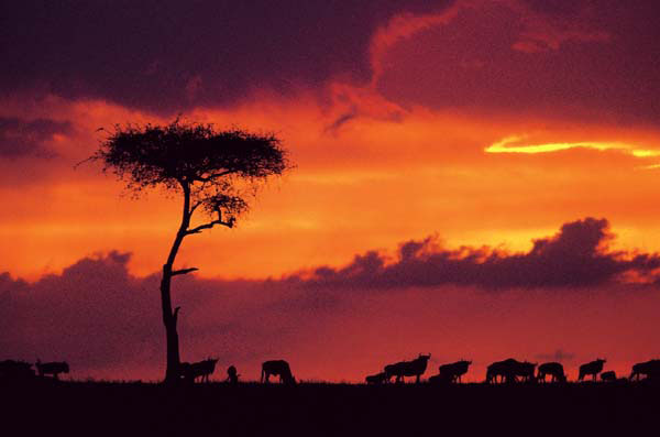 The Migration: Twice a year, propelled by the rains, 1.3 million wildebeest, 200,000 zebra and 300,000 Thomson’s gazelles gather in the Serengeti to undertake an 800 km trek to new grazing lands. The precise timing of the migration varies but generally, the herbivores congregate and move out at the end of May, sometimes over a period of weeks, sometimes over a period of as little as three or four days. They then head west on the first leg of a roughly triangular 800-km circuit that takes approximately 3-4 months and ends in the Masai Mara National Reserve of Kenya. When the grazing here is exhausted the tide of herbivores turns and reverses its progress returning to the short grass plains of Tanzania.